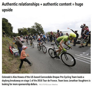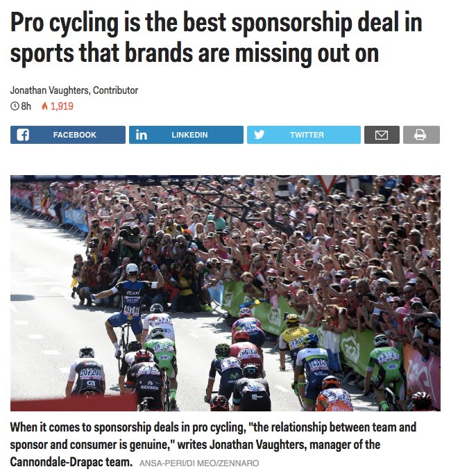 Just admit it, you're not paying attention, which is why you may be surprised that Cannondale-Drapac manager Jonathan Vaughters says that "pro cycling is the best sponsorship deal in sports:"