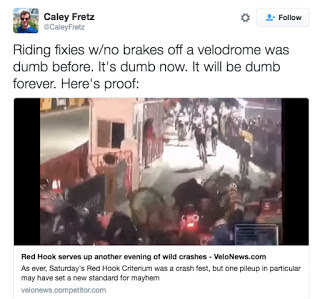 Of course, I'd be remiss if I didn't point out that when riders crash in the Red Hook Crit this particular writer dismisses the whole thing as "dumb:"