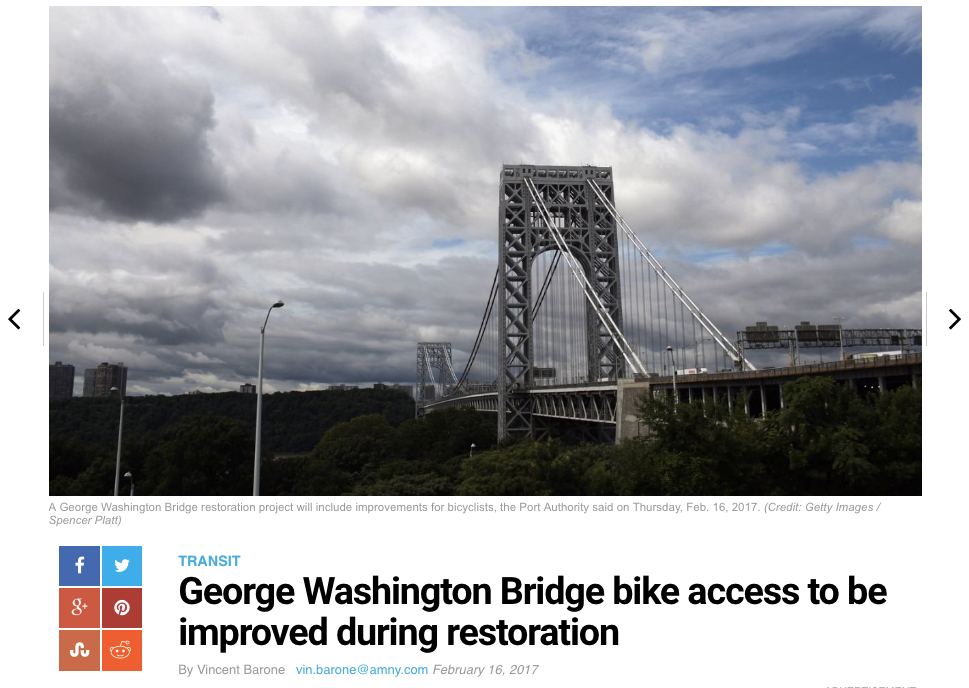 The agency added the plans to the project after receiving feedback from the cycling community. The George Washington Bridge rehabilitation already includes designs to improve cycling and pedestrian access to the bridge. Narrow staircases leading to the bridge will be replaced with ADA-compliant ramps. And the existing access ramps will be widened and redesigned with gentler curves.