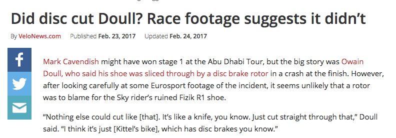 There is a brief moment in which foot-on-rotor contact would have been possible. As Doull falls left, the inside of his left foot, which is where he was cut, would have needed to go under his own bike and hit the left side of Kittel’s bike, where the disc rotors are located. That doesn’t look likely based on the footage (Kittel appears to be launched forward when Doull’s own bike slides under Kittel’s bike), but stranger things have happened in high-speed crashes.