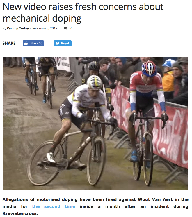 Speaking of high performance machines, the World Wide Internet Web has been abuzz recently with speculation that professional cyclocross bike rider Wout "There It is!" Van Aert is secreting a motor in his cyclocrossing bicycle: