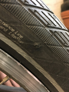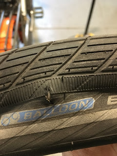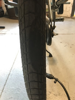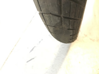 Nevertheless, I realized yesterday that my procrastination was getting ridiculous, and I was also missing my own WorkCycles and its more generous proportions. So I brought the bike into my makeshift workshop and performed a diagnosis. The most obvious symptom was that the tires had been punctured in what I imagine was a final "Fuck you" from the thief or thieves after they had failed to open the wheel lock, but closer inspection revealed a considerable flat spot from when they'd dragged the bike away: