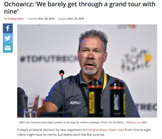 During the General Assembly of the International Association of Cycling Race Organizers (AIOCC), the three groups decided to decrease team rosters from nine to eight in the Grand Tours and from eight to seven in their other events. This new policy will go into effect for the 2017 season.