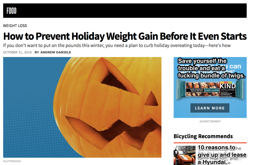 I mean sure, our ancient ancestors didn't have fridges full of food twelve months out of the year, but I doubt you can thwart millennia of genetic programming with "cheat days:"