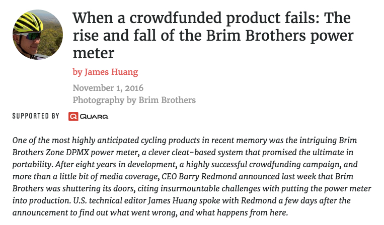 Anyway, apparently after getting funded and then sume, Brim Brothers fell apart like a crabon frame, as James Huang recently chronicled: