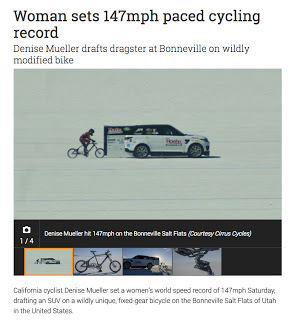 This past weekend cyclist Denise Mueller made history when she officially became the World's Fastest Frederica, piloting a bicycle across the Bonneville NaCl Flats at 147mph, or [note to assistant: insert number here] kph: