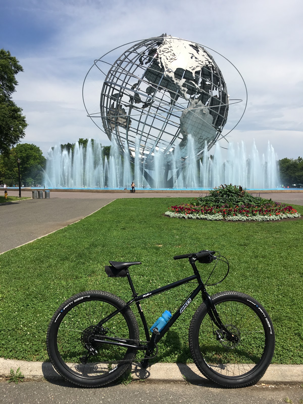 Then we headed to my mother's place in Queens where the kids disembarked, and from there I hopped on the Jones and rode to to Cunningham Park, undoubtedly the finest mountain bike trail system within New York City limits. It's a good 10 miles or so from where my mother lives straight through the heart of the city's largest borough, and the ride takes you past storied landmarks such as the Unisphere:
