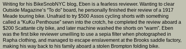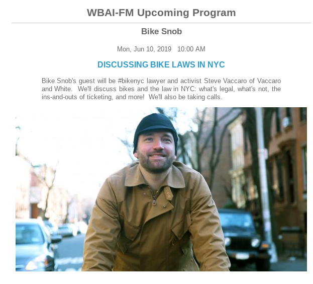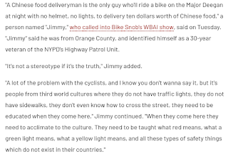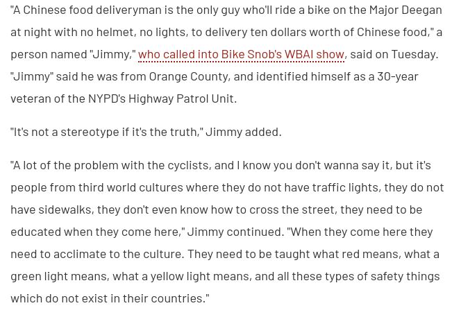 Here's a more direct link to the show:Yesterday a member of the NYPD called into my radio show to comment on delivery cyclists. It's...rather enlightening. Starts at 52:02, have a listen:https://t.co/2eEQ8p6KYw— Bike Snob NYC (@bikesnobnyc) June 11, 2019I'm still very much figuring this radio thing out, and I didn't respond at length to the caller because I thought I was out of time. (My guest did however respond in a thoughtful and diplomatic manner.) I suppose there's a certain type of person out there who gets off on making facile ethnic characterizations on a public forum (in fact one of them happens to be president), but even so I regret not pointing out to the caller that: