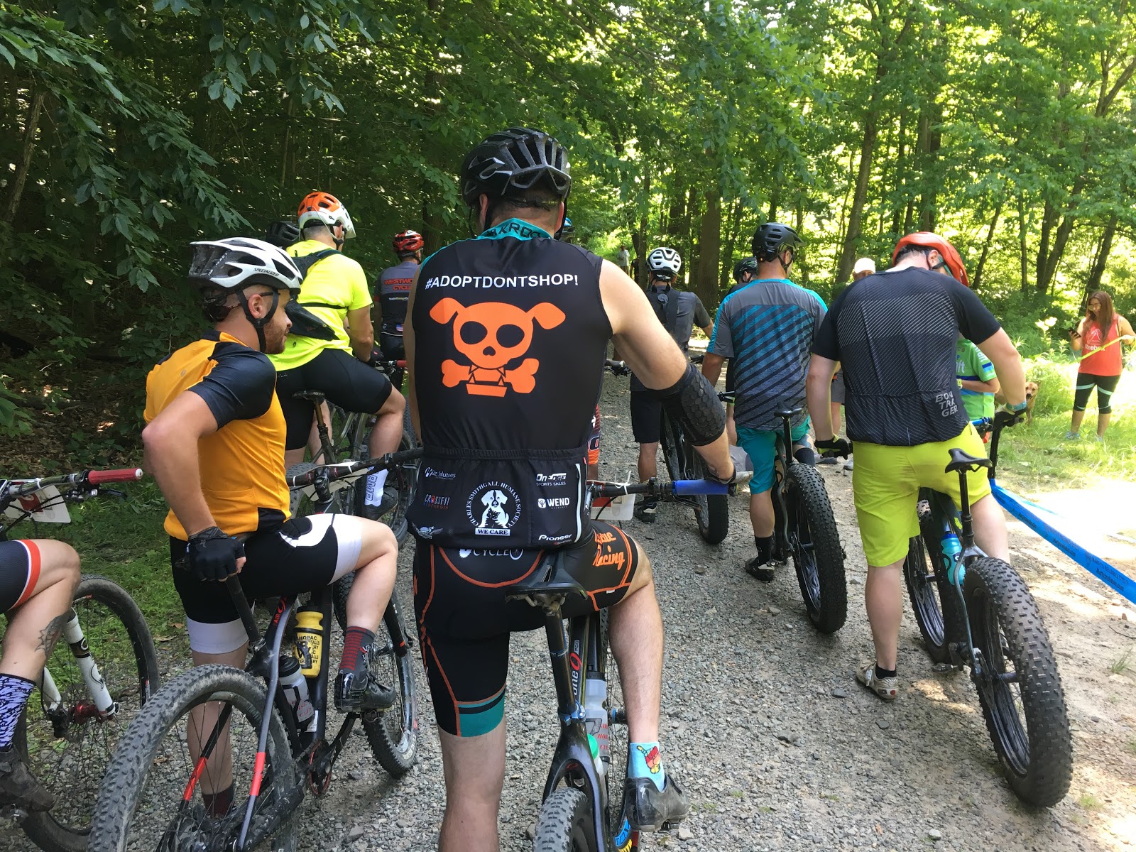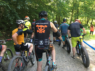 I raced in the singlespeed category, and as you can see they staged the fat bike category before us. (They like to keep the novelty bike doofuses together, you see.) An aborted Central Park race the weekend before notwithstanding, it had been quite a few weeks since I'd raced a bicycle; moreover, it had been a good two years since I'd raced a mountain bike. (I believe my last competitive outing was the so-called "Singlespeedapalooza" race in 2017.) And on top of all that, this particular race starts with a lot of climbing, which meant that within minutes my face was bright purple and my heart was trying to eject itself from my throat.