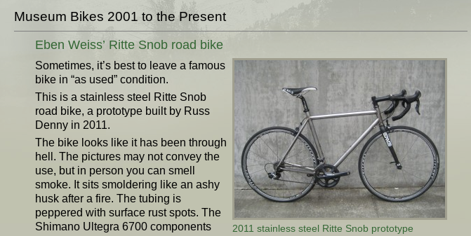 Also, awhile back I mentioned I divested myself of the Ritte Rust Bucket, and I'm pleased to announce that it is now part of the Classic Cycles collection on Bainbridge Island, WA!