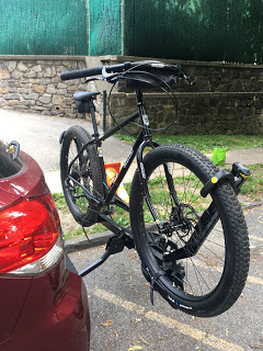 My appetite for fat-tire riding having been whetted, I was eager to undertake a longer adult-sized excursion over the weekend. However, owing to my wife's demanding career I was parenting solo. So how to meet the bike-testing requirements of my own not-at-all-demanding "career?" Well, I popped the Jones LWB on the trusty Saris SuperClamp EX (which accommodated the substantial dimensions of the bicycle with nary a complaint):