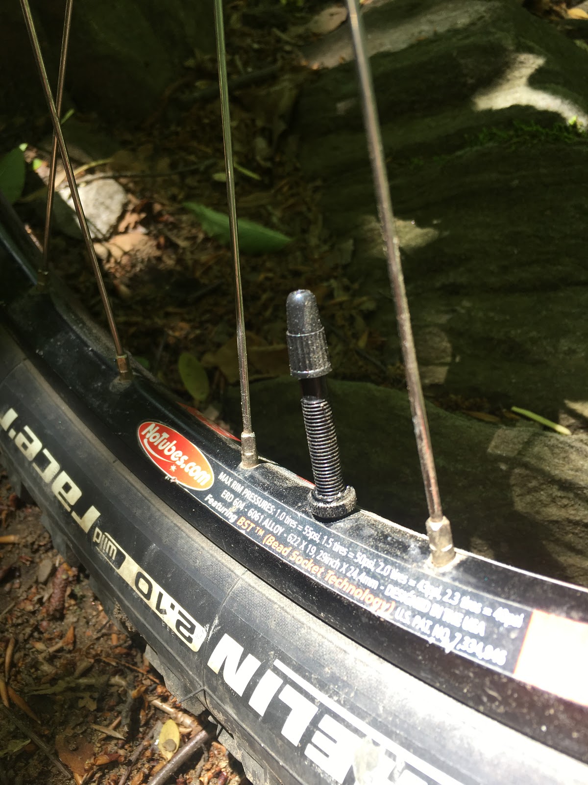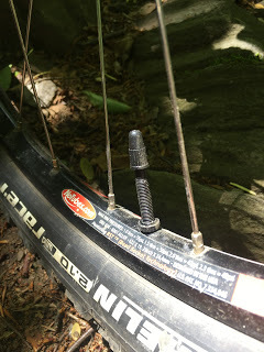 Prior to the ride I had also re-tubeless-ized my tires, since out of laziness I'd allowed them to lapse into a tubed state. See, I'd appropriated the valves from this bike when I tubeless-ized the Jones awhile back, and the other day I finally got around into stopping in a bike shop and getting a new set so I could seal up the rubber on the Engin again.