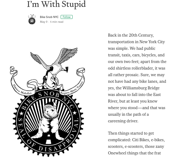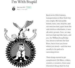Was feeling insecure about how I did on the radio this AM until I read this, now I know I did just fine. pic.twitter.com/l9clLzCX0Y— Bike Snob NYC (@bikesnobnyc) June 3, 2019As I mentioned, I had no plans at all to be on the radio until this past Thursday, when the station said, "Do you want a radio show?" and I said, "Yes." Anyway, if you missed it you can listen now thanks to the miracle of streaming technology; just go to the archives and choose "Bike Snob" from the pull-down menu. And if you don't have an hour to waste listening to me bloviate, just skip to 11:47, which is when I take a call from an "avid cyclist:"