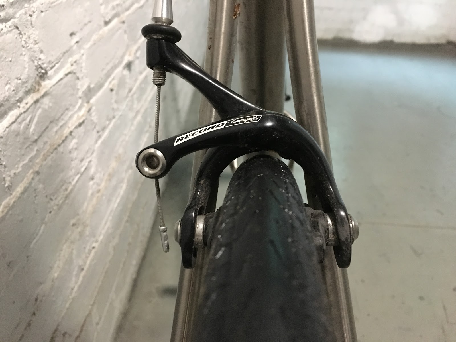 I'd been worried about the rear brake as the spring protrudes beneath the caliper arms, but in practice it appears that won't be a problem. This made me happy, because it means this 18 year-old titanium bike just happens to be pretty much exactly what I'd want if I were ordering a custom road frame, in that it has a threaded bottom bracket, a standard head tube, and adequate tire clearances. (I mean sure, maybe I'd consider disc brakes since it's all going that way anyway, but in the meantime I'm more than happy with my primitive rime breaks.)