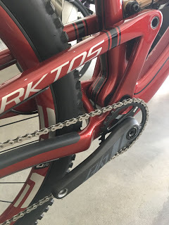 I'm just a caveman, and your dual-suspension bicycles frighten and confuse me. Still, I'm happy to look at them, and this one had a whole asymmetrical chainstay thing going that was interesting in an M.C. Escher-esque kind of way: