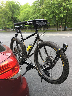 I also did something I rarely do these days, which was to transport my bicycle to the trail by using THE CAR THE BANK OWNS UNTIL I FINISH PAYING THEM BACK in conjunction with the Saris SuperClamp EX hitch-mounted bicycle rack: