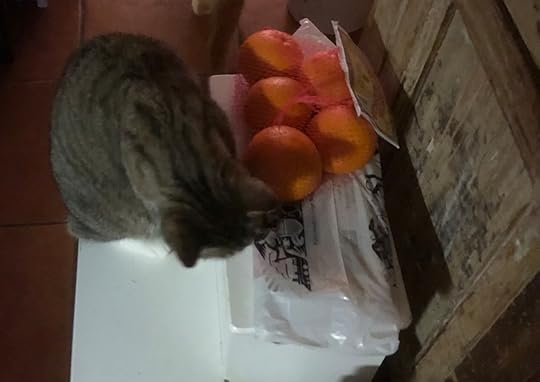 The enzyme scrub smells very orangish. Cats don’t like citrus, do they. Do they? Butterfly is observed checking out and reclining on the steps where I have a small bag of oranges stashed. This isn’t going to plan.