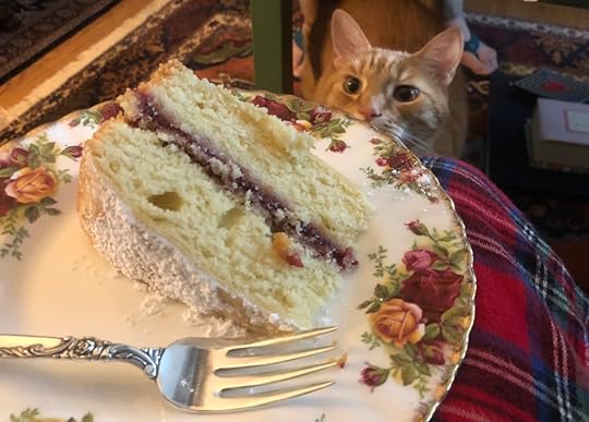 Luna walks through the lavender and rosemary. Instead of skirting it like she’s supposed to, she sniffs both, picks up a branch of lavender and walks away with it in her mouth. WHAT? Next time I see her she’s meditating on the meaning of life. And Alistair in all this? He’s the Lion King. He says, “Let me eat cake.”