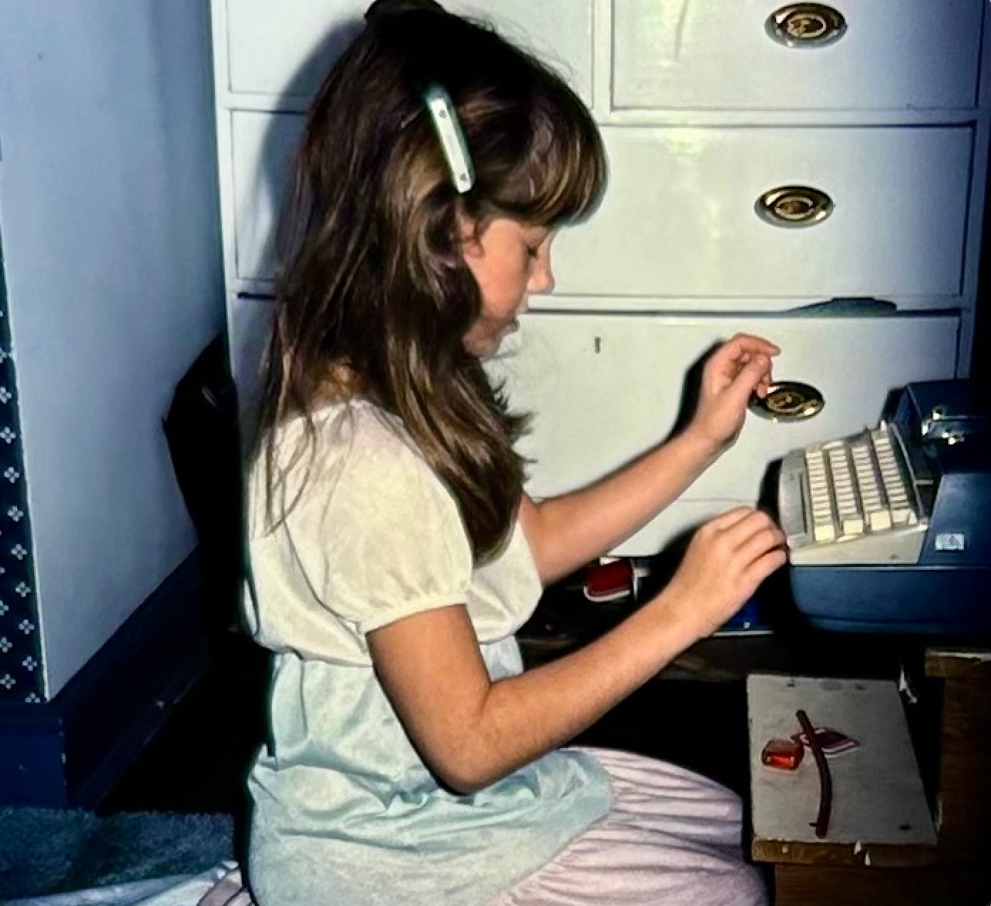 My mom has been going through old slides and photos of late, and sent me this one, in which I seem to be waiting patiently for the muse to enter my body and guide my hands to the keys of my parents’ electric typewriter.