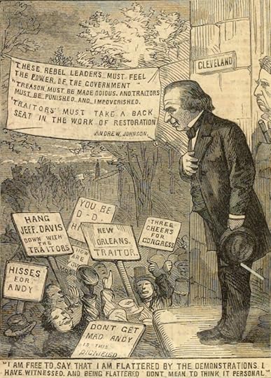 Johnson took his case to the people in the infamous “Swing Around the Circle” speaking tour of 1866. It didn’t go well, as Blaine observed in the second volume of his Twenty Years of Congress. “Wit and sarcasm were lavished at the expense of the president, gibes and jeers and taunts marked the journey from its beginning to its end.”