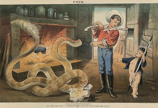 “Who are these men who in newspapers and elsewhere are cracking the whip over Republicans now and playing schoolmaster to the Republican Party and its conscience and convictions?” Conkling thundered as Curtis nervously looked on. “Their vocation and ministry is to lament the sins of other people. Their stock in trade is rancid, flat self-righteousness. They are wolves in sheep’s clothing. Their real object is office and plunder. When Dr. Johnson defined patriotism as the last refuge of a scoundrel, he was unconscious of the then undeveloped capabilities and uses of the word ‘reform.’”