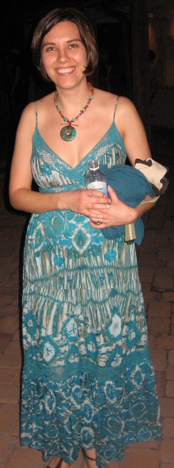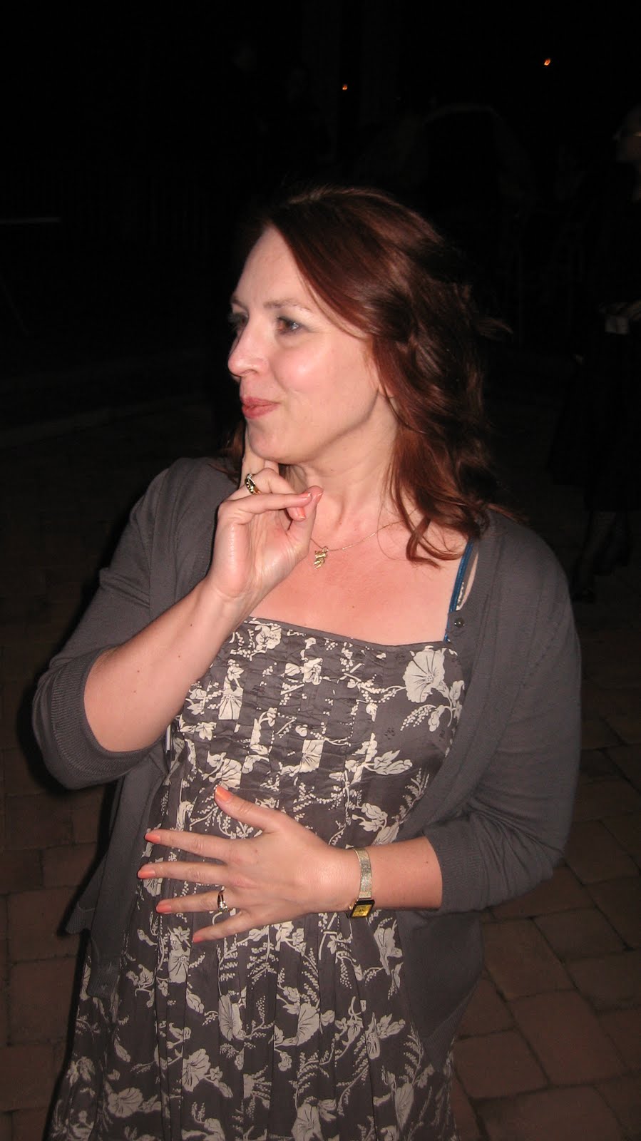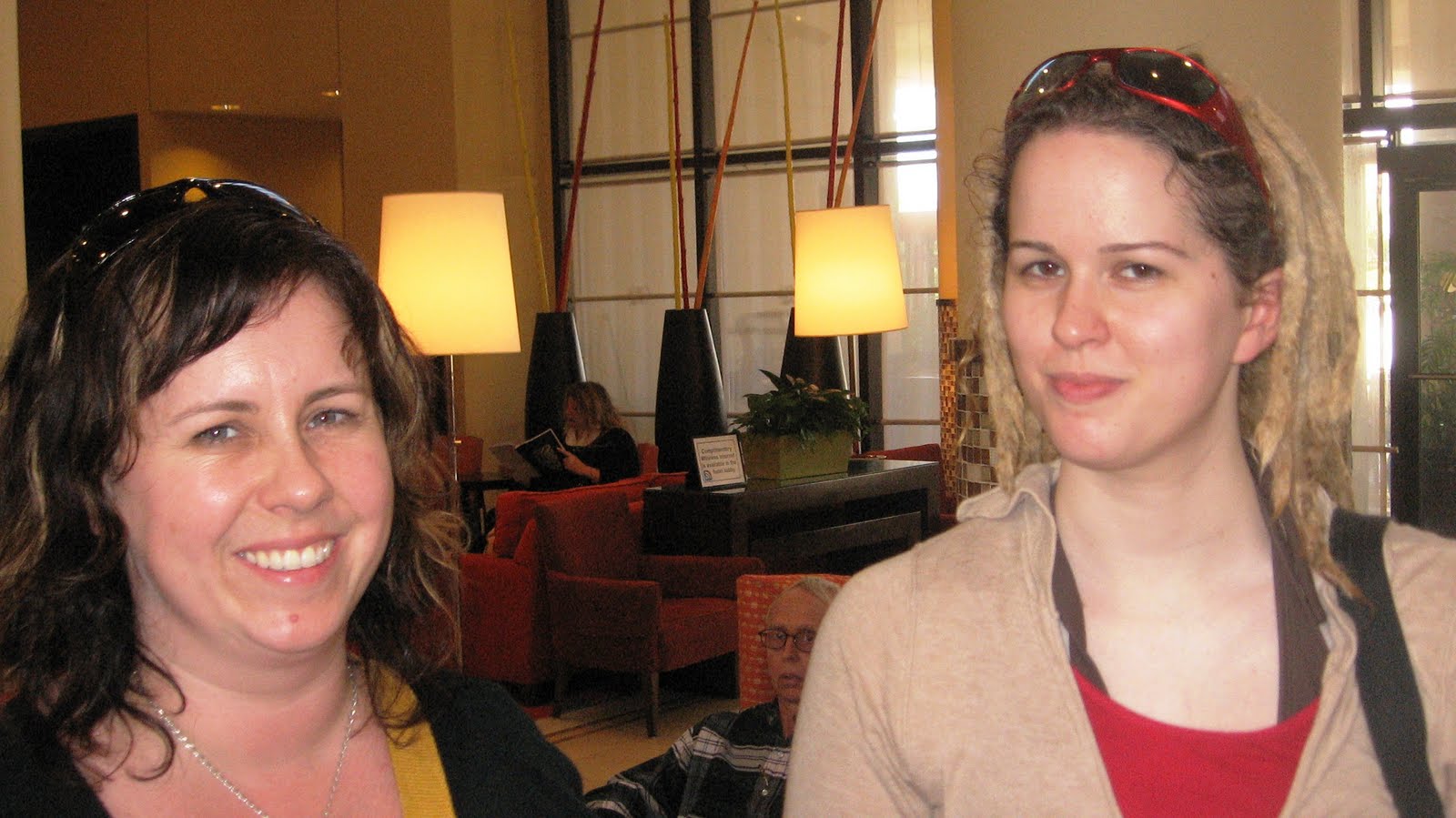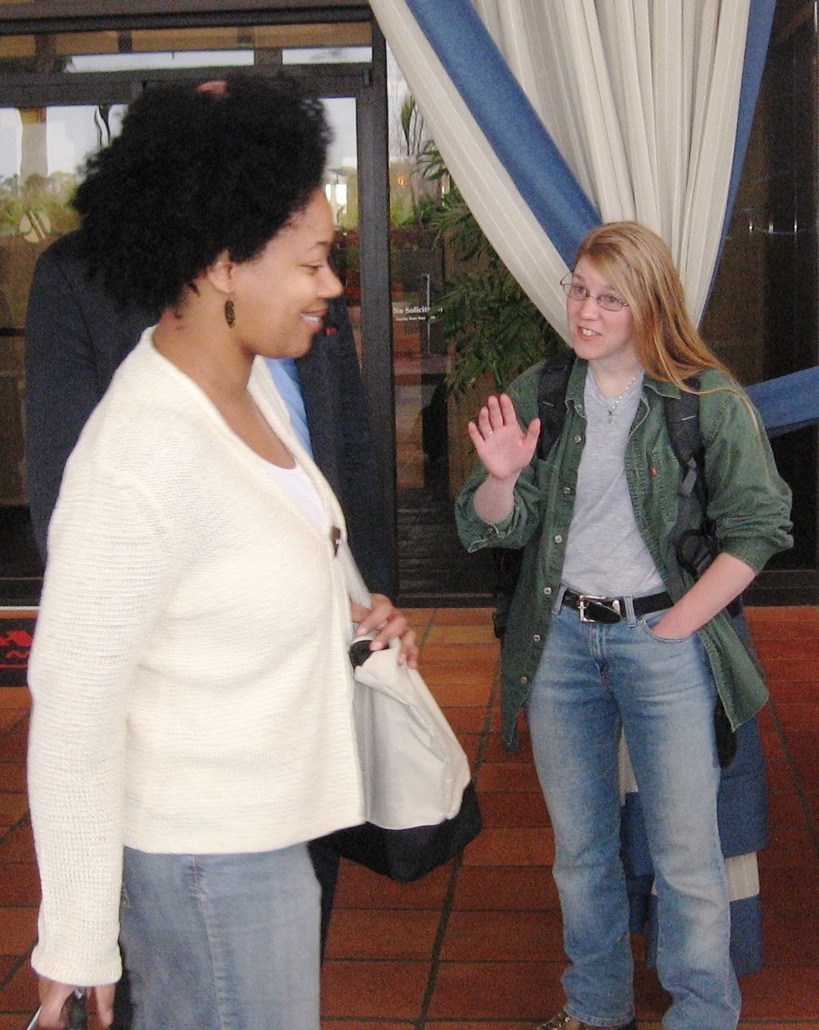 Below: Three photos of Sydney Duncan, Liza Trombi and Karen Burnham. Their conversation eventually focused, as you can see, on Karen's amazing tattoo, a 14-hour job I should have gotten a photo of.