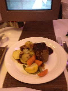 So these are massive seats with little foot rests for you to stretch out on while flying. And a table pops out from by where the TV is. I watched Men In Black 3, which was great. I loved how they tied the series together at the end.