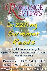We have awesome prizes for you: Grand Prize of $50 Amazon Gift Certificate, 4 pairs of RomCon 2011 tickets, and tons of book giveaways! Including a copy of my backlist!