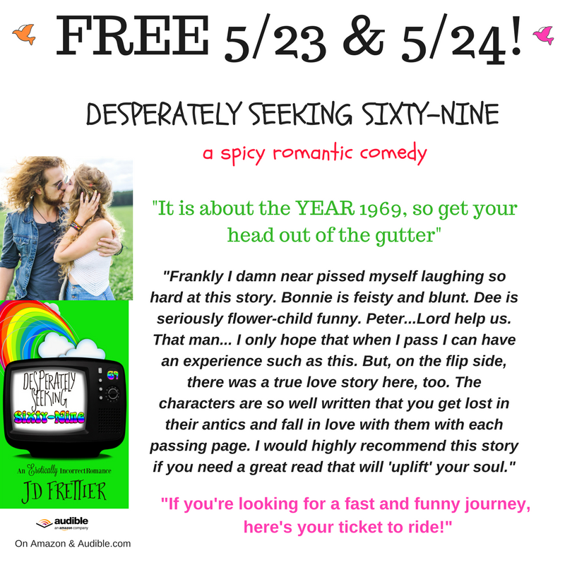 JD Frettier is the nom de plume of USA Today Bestselling Author Jennifer Theriot. Being a child of the 1960s and Woodstock era, she was elated when a quirky couple spoke to her, requesting their love story be told. It was an offer she couldn’t refuse, so she decided to venture into the world of paranormal via ‘channeling’ with her debut novella, Desperately Seeking Sixty-Nine. JD’s laptop and mind are now open to new characters. She’s already interviewed and selected one for the next installment of her Green Room Chronicles….so stay tuned!