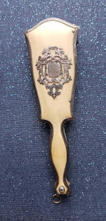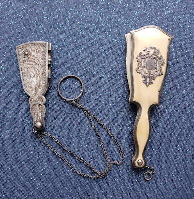 The one on the right is four inches long and made of bone or ivory with silver edging (also hallmarked) all around on both covers and elaborate silver ornamentation with room for a monogram.