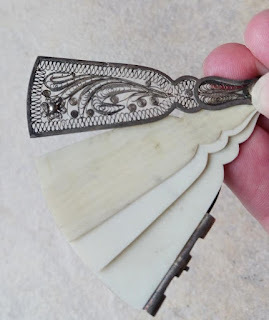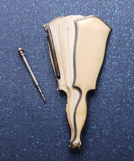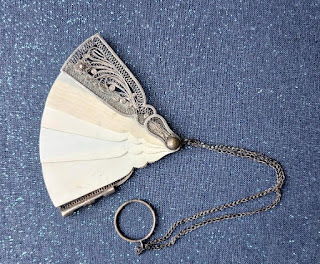 The silver one on the left is a dainty two and a half inches long, with the chain and ring for wearing adding another six inches. The ring and chain indicate that this was intended to be a dance card and not just a note pad. There is a tubular holder for a pencil, now missing, and six thin leaves made of what looks like bone.