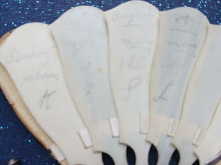 This one still has its tiny pencil for writing on the six bone leaves, which are held together by a silk ribbon woven through them. A delightful confection to carry to a ball…but what is even more delightful is the pencil inscription it still contains.