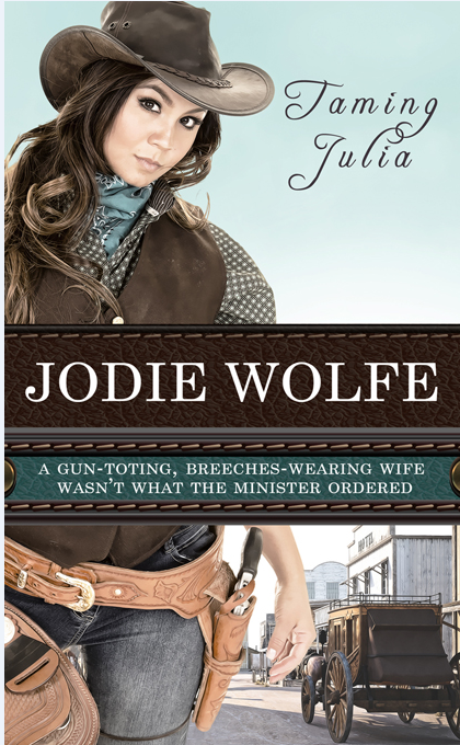 Here's the back cover blurb:In 1875, Kansas bachelor Drew Montgomery's sole desire is to serve God, but his congregation's ultimatum that he marry or leave, forces him to advertise for a wife by proxy. Jules Walker strides into Drew's life wearing breeches and toting a gun and saddle—more cowboy than bride. After years on the trail, she's not exactly wife material, but she longs for home and family and will do anything to ensure Drew never discovers what she really is.