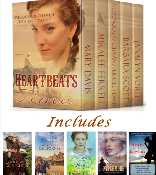 Very good advice, especially the last sentence. Tell us about the featured book.HEARTBEATS IN TIME is a set of 5 historical books of Old West Christian Romance (4 novels and 4 novellas) by 7 bestselling, award-winning authors. I’m proud to be in a set with these awesome authors! (Buy link: https://amzn.to/2VzRBoI)THE NOVELS:The Widow’s Plight(Book 1 in the Quilting Circleseries) by Mary DavisA single mother steps out of the shadows of abuse and into the sunshine. But will a secret clouding her past cost her the man she loves? Finding Love In Last Chance, Californiaby Miralee FerrellA young woman on her own after the death of her father, tries to run the family ranch while solving the mystery of sabotage--can a wandering cowboy with a young son help solve her problems and possibly bring love into her life?Dreams of My Heartby Barbara ScottCan a reluctant bride and her new husband fall in love despite their wounded hearts? Hills of Nevermoreby Janalyn VoigtCan a young widow hide her secret shame from the Irish preacher bent on helping her survive? Based on actual historical events during a time of unrest, Hills of Nevermoreexplores faith, love, and courage in the Wild West. THE NOVELLAS:Heart of a Cowboy Novella Collection--four Old West romances“Hearts in Pursuit” by Susan Page Davis~Can Abby and Sam fight their way through danger and violence and live long enough to find love? “Hearts Reunited” by Miralee Ferrell~Tayloris determined to save her ranch after her father’s death, but she won’t let anyone help—especially not her old friend Jesse Townsend.“Have Dress, Will Marry” by Yvonne Lehman~Julie Hayes must escape from Wildcat Mountain. Her only hope is to approach the cowboy, saddleback preacher Timothy Sullivan, and ask him to marry her.“The Hand-Me-Down Husband” by Vickie McDonough~Ellen didn’t want a hand-me-down husband, but could their marriage be God’s will for them both?