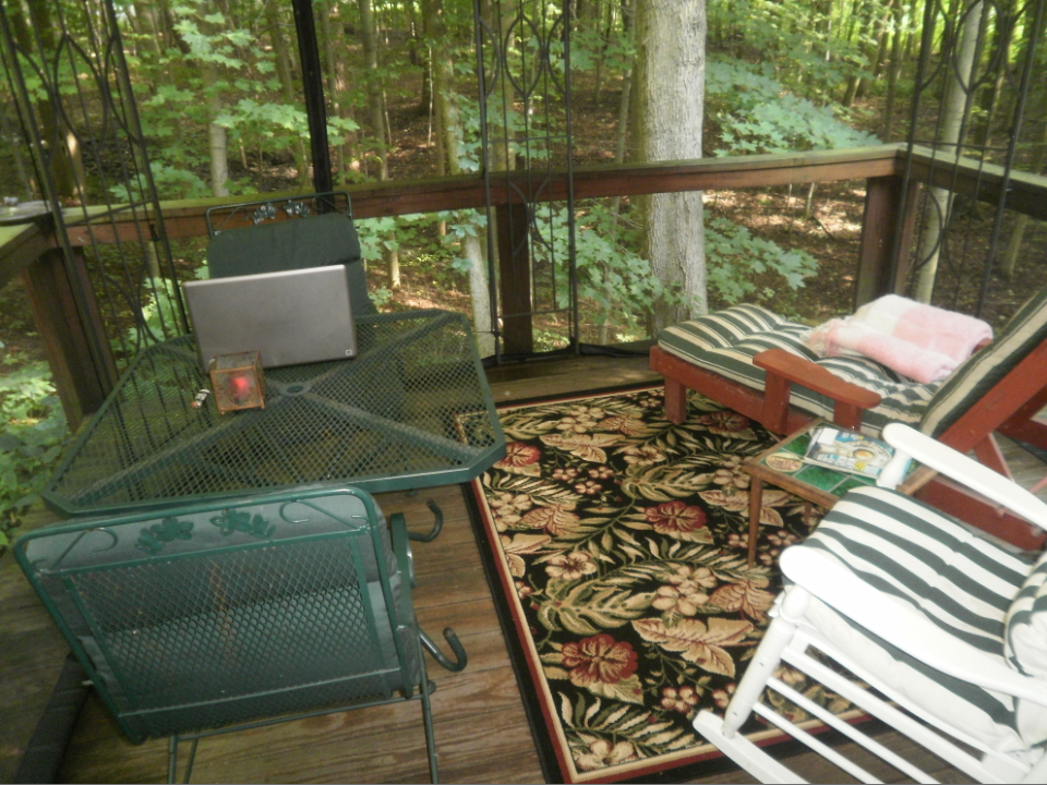 Writing porchI’d love to feature that on my blog, too. Please give us a glimpse inside your home. My home is an A-frame in the middle of three acres of woods. Very private. But the driveway is no fun in the winter. I attached a picture of my office and my porch where I do my writing in nice weather.