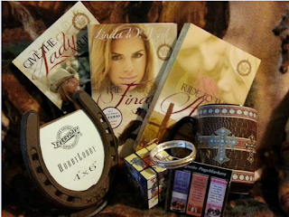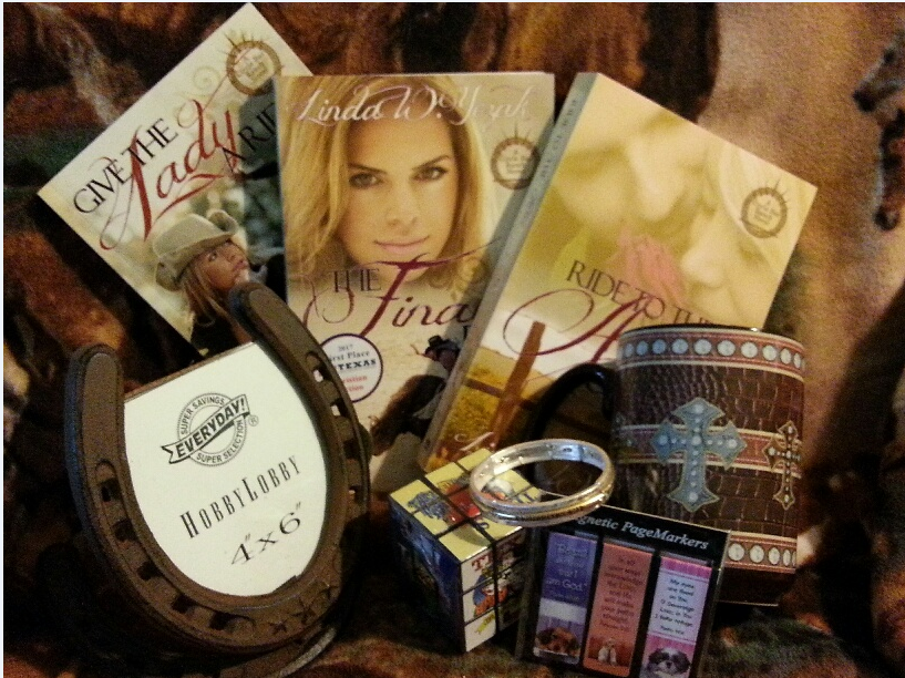 Linda is offering a giveaway prize to one lucky entrant on her blog tour! As pictured, the prize includes a signed print version of the series, a 16-ounce Christian cowboy mug, a horseshoe picture frame, a Ph. 4:13 stretch bracelet, a cute set of magnetic page markers, and a Texas Rubiks cube just for fun. All you have to do to enter is to leave a comment.