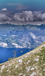 I grew up on a council estate on the banks of the river Tyne(I might have mentioned it...) that was steeply stepped and for entertainment we used to nick those red and white plastic gas board barriers and use them as makeshift sledges down the steps - usually stopping via the medium of smashing into a wall, all good fun. I found that crossing my mind as I looked down the sheer side of Monte (Mount) Baldo down to Lake Garda and lovely Malcesine and wondered if I'd beat my record for distance. Then, as I looked around at the top of the mountain it'd taken two, sweaty German filled, cable cars to get to, I wondered why would I do that? It was gorgeous, peak after peak of snow capped wonder screamed for my attention, the freshest air I've ever breathed chased the city smog I tend to carry round with me right out if my lungs and the view across the magnificent lake will stay with me for ever. It was a surreal experience being up there ( its a journey that's taken me a lot longer than two cable cars believe me!) and I could have stayed up there for the rest of my life.