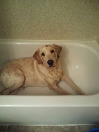 Oakley is a 2-year-old yellow Lab, with a distinct coat that features unusual spots. He is described as good with kids and other dogs. He has a unique coat, on his face he has spots of a darker yellow (champagne) he also has spots of the same color going down his sides and legs. He is micro-chipped and registered to Harker.