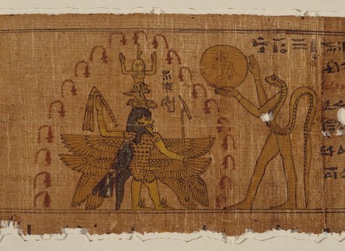 The strange winged creature standing in front of the serpent in this scene represents several destructive forces, good and bad, inherent in various Egyptian gods. These powers were not normally represented in specific shapes; hence, the unusual being here, like the winged figure in the large stone relief also in this case, is not a single god but a representation of several abstractions. The god Bes was one of the deities associated with this composite being; as a guardian of women and children, he acquired the role of protector of the birth of kings and of the sun, which sprang forth anew each morning from the underworld, where it had been threatened by snakes during the night. The images of the child and the snake on the papyrus reflect these concepts.