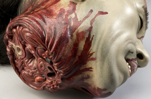 The donation of this model to the Science Museum London came with little accompanying information, but it is known that it was produced in England, between 1910 and 1922. The braid is real human hair, and the plaster and finish is of a high quality. Given its “blood-splattered” carrying case, it was most likely a prop in a traveling sideshow.