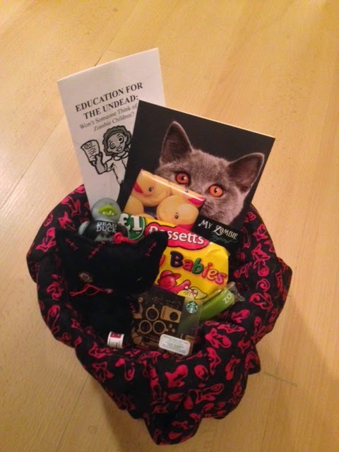 - helpful literature about the undead- a personalized card signed by Kit and Winston- $15 Starbucks gift card- Jelly Babies- Zombie Zoo Boo keychain plush- rubber duck light switch plate- Zombie Strong bracelet - My Zombie Boyfriend magnet- my gratitude