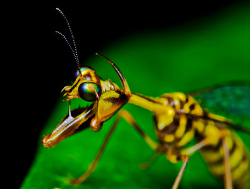 Mantisflies are neither related to mantids, nor flies, but are more related to lacewings. Their praying mantis-like claws are an example of convergent evolution, by which unrelated organisms develop resembling structural characteristics in response to similar needs.