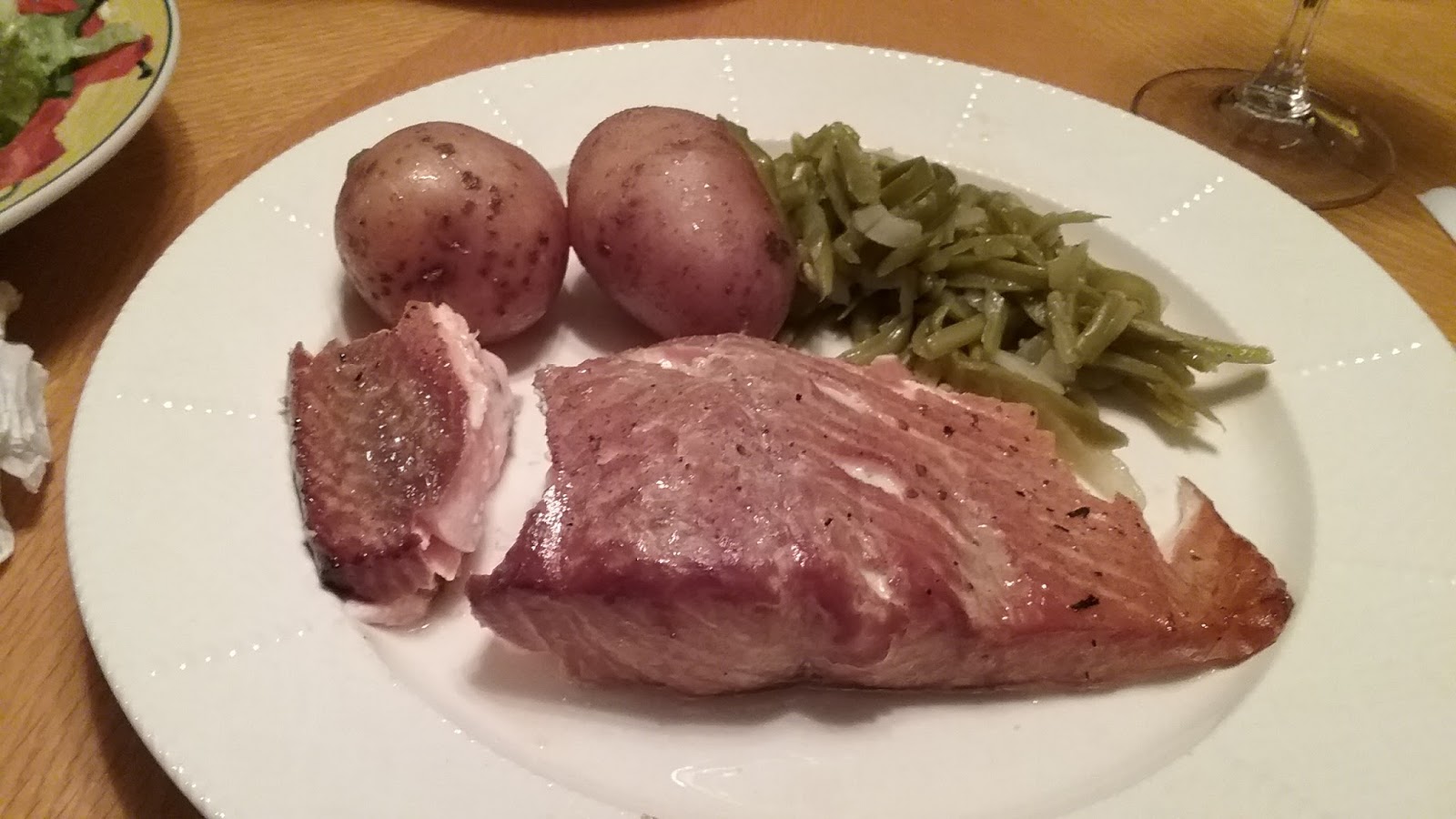 So right off, our supper last night was amazing! Liz's Hoosier green beans rocked and my cedar-plank salmon was perfectly delicious. We added hot bread and a salad and man, oh man, it was a great supper. We had wine, too, of course--mine was Dry Creek Cab and Liz's was the last of her bottle of Sangria from Warner Winery here in South Haven. We were really impressed with their wines--well, okay I was very impressed with their wines. Liz just got a good buzz going and agreed with whatever I sa...