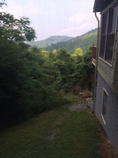 I'm sitting in the nook in my daughter-in-law's kitchen this morning. I'm the only one up. Well, other than Bourbon and Blue, the cats who actually own the house here in the Blue Ridge. It's Sunday. Bright and clear and filled with birdsong (which might be driving the feline homeowners just the slightest bit crazy.) It's hot further down the mountain, but not so much here, so the windows are open. This is the view.