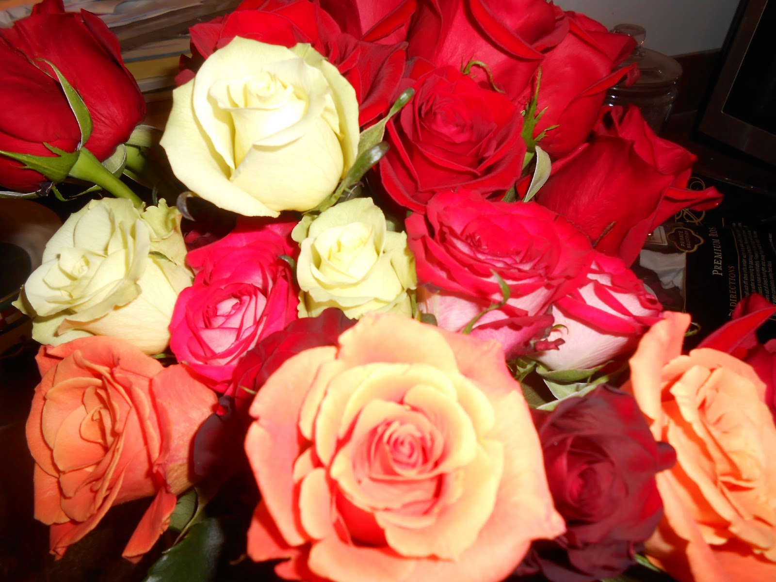 About a week ago, I got to quit my retail job to write full-time! Yay! My hubs (I need to think up a nickname like Kristi's Radioman) bought me the colored roses in the foreground and DD (she's too old to be Bebe like Kristi's little angel) got me the red ones. Aren't they gorgeous?They sat on the kitchen table and boy, did the smell good! Every time I saw them, I smiled. Not only were they stunning, they represented the bright new future ahead of me.