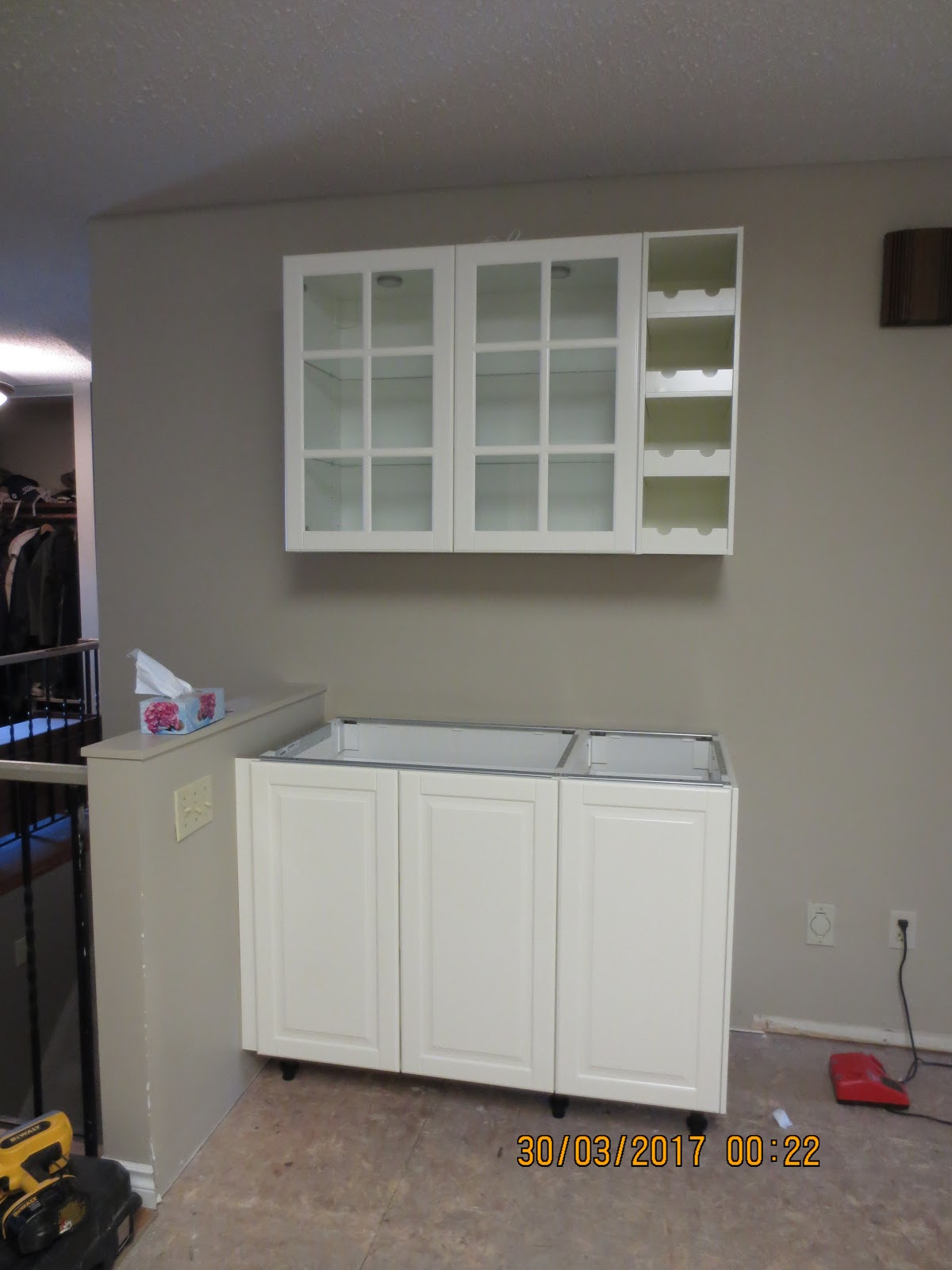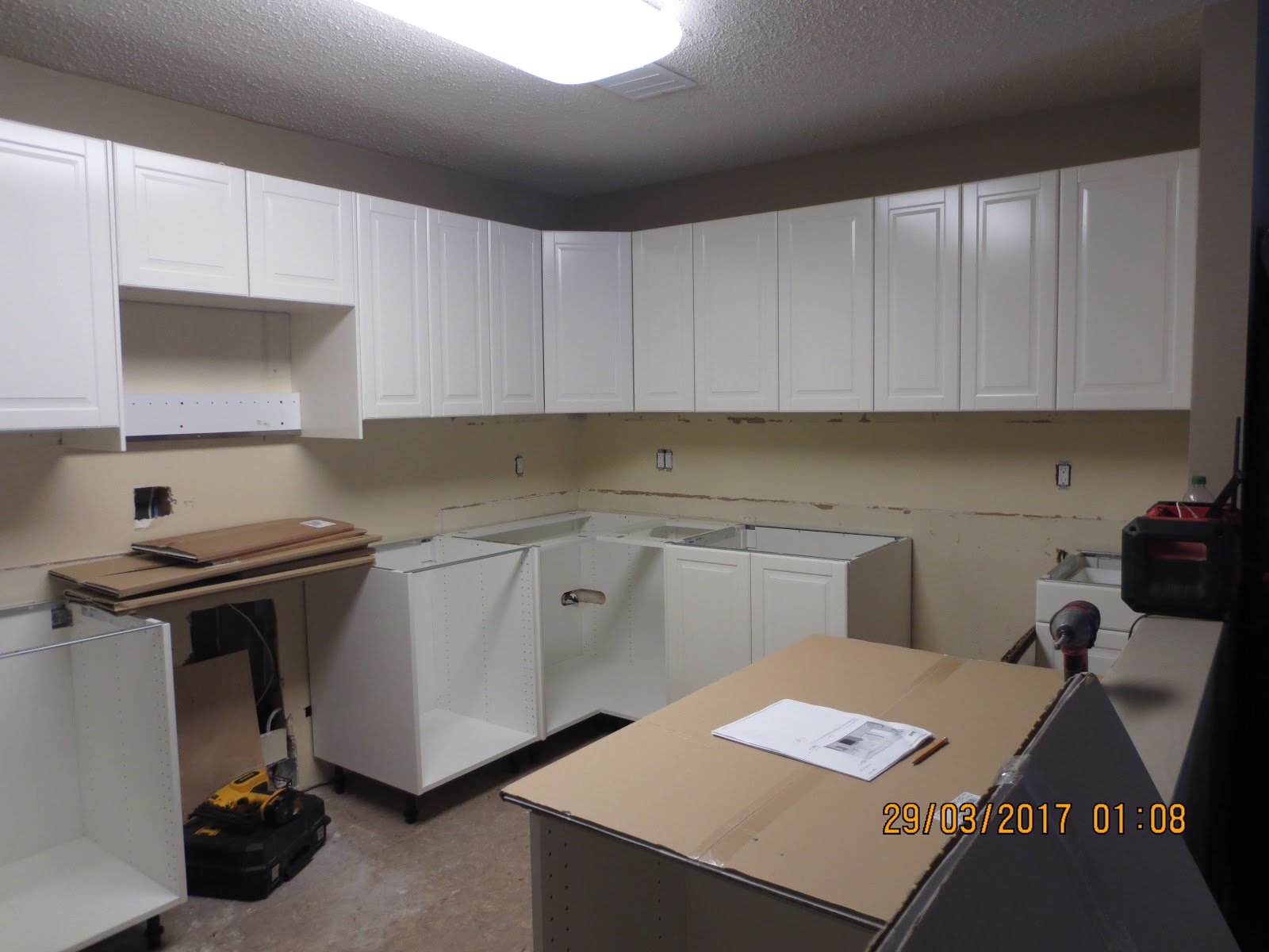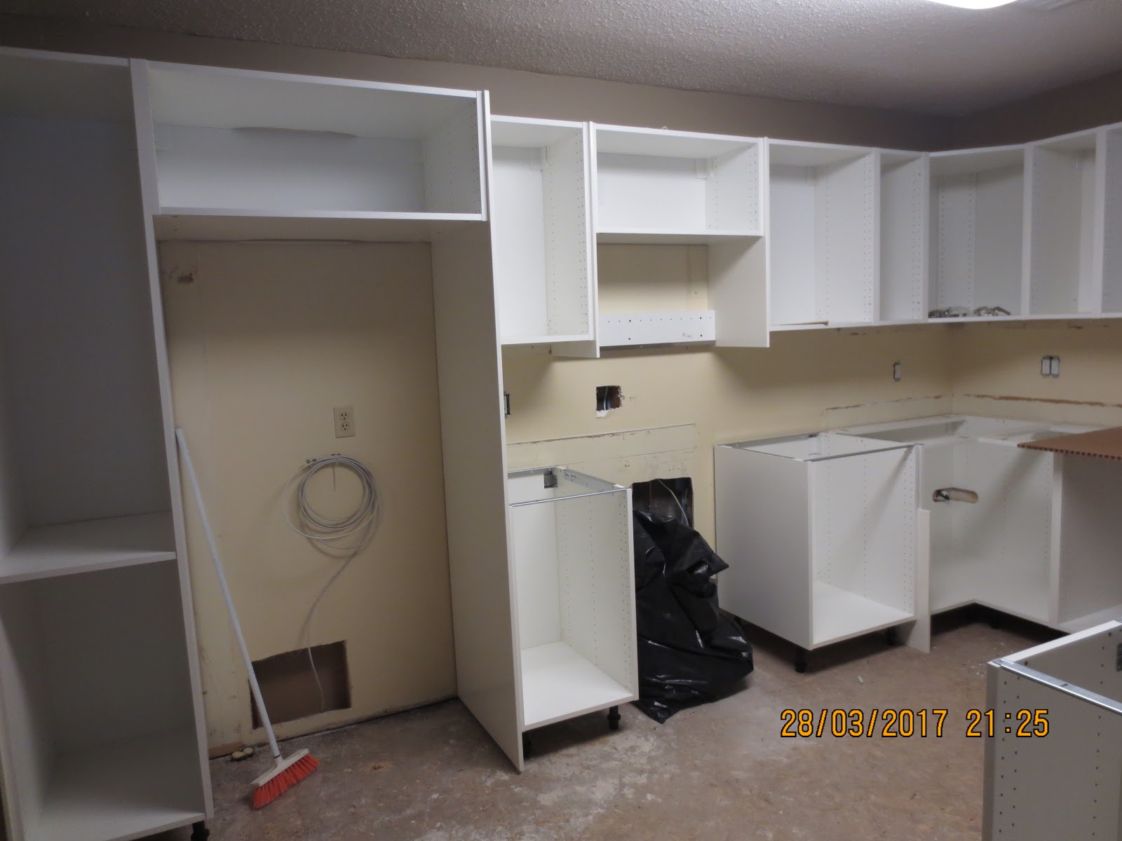 The cabinets begin to go in. Obviously that big hole is for the fridge.