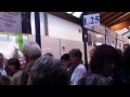 Hicimos un viaje muy cómodo en el Tren de los Escritores (un tren lleno de escritores), hacia Brive-La Gaillarde, donde se celebra el 30ème Aniversario de esta feria. Esta vez nos mimaron mucho en el tren, con un desayuno en el andén con mesas y manteles, y más tarde un almuerzo durante el viaje, con un menú típicamente francés, de primera. Como aperitivo nos dieron: Toda una destilería de Terres Rouges – Salers, y de amuses-bouches con productos regionales. Como entrante: Medallones de fois-gràs de pato medio cocinado, parmentier de pato en canasta, crema de higos y trocitos de higos frescos. Como plato fuerte: Rollo de ternera real, enrollada con hígado de oca, arroz con trufas, y cepas y zanahorias salteadas en aceite de oliva. Ensalada con almendras y queso Rocamadour. Postre: Crumble de manzana, con nueces acarameladas, y confitura de albaricoque. Café, cognac La Vieille Prune Louis Roques de Souilac. El vino blanco que roceó este festín fue Montravel, Château Moulin Caresse, y el vino rojo fue un Bourgogne Cru Classé, y Chauvenet Pinot Noir.