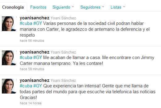 Mientras Castro reprime a Antúnez ante la visita de Carter a Cuba, Yoani Sánchez anuncia en Twitter que será recibida por Carter, sin el más mínimo problema.