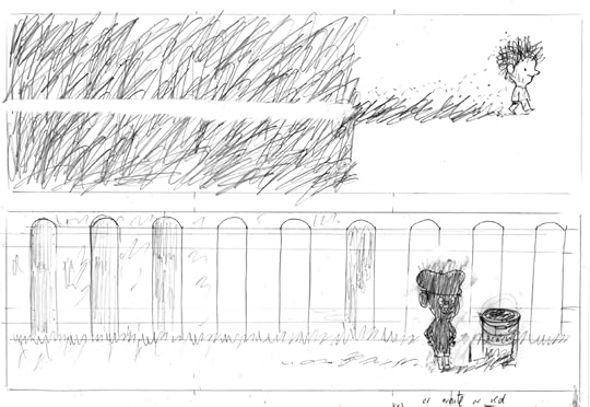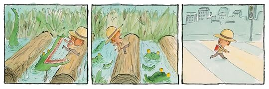 “A veces tengo una idea que se me ocurre caminando o en bicicleta, me la anoto y después la uso quizás transformándola. Por poner un ejemplo, caminando un día vi un parque de juegos de niños sin niños porque estaban en la escuela, y la imagen me llamó mucho la atención. Es una imagen con muchas ideas dentro. En la tira que hice los niños están jugando fuera del parque construido para ellos con algo tan adulto como una estatua. Otras veces quiero dibujar un cocodrilo, o una cigüeña o un panda y es una excusa para la historia, a partir de ahí se puede crear una situación. O puedo preguntarme que pasaría si… Creando una situación sin final hasta que encuentre ese final”.