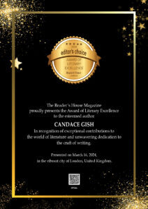 A big congratulations to our author, Candace Gish! Readers’ House Magazine London presented Gish with the 2024 Award of Literary Excellence for “exceptional contributions to the world of literature and unwavering dedication to the craft of writing.”
